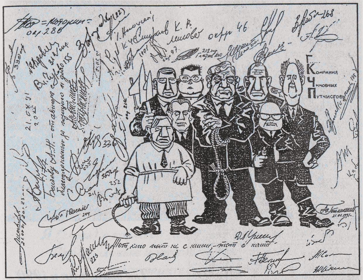 Пару слов о так называемом «путче» 19 августа 1991 года. Два дня я уходил из Мариинского дворца в полночь к семье, а приходил к 8 утра и не видел на улицах каких-либо приготовлений к отпору или нападению на органы власти, хотя в коридорах дворца и были вооруженные люди, готовые отразить нападение. Мне вообще казалось, что это хорошо спланированная провокация по проверке различных общественных сил города к «силовому» решению смены власти. К этому был не готов и «лидер» Собчак, пропадавший несколько дней неизвестно где. Больше всего запомнилась акция сбора подписей на карикатуре (почему-то нужно было уговаривать, чтобы дали расписаться ... И, такое впечатление, что было несколько таких карикатур, которые давали подписывать не всем), на которой была изображена руководящая часть организаторов так называемого «путча» (рисунок). Неожиданным было появление со своими лизоблюдами Собчака перед выступлением с балкона Мариинского дворца председателя нашего Совета ...
